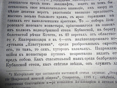 Но самой драгоценной находкой стала для нас статья Алексея Воскресенского, полученная из Справочно-информационного фонда Государственного архива Краснодарского края. Называется статья «Покровский женский монастырь в Кубанской области, Ставропольской епархии (из путевых заметок паломника)», опубликована она в «Ставропольских Епархиальных Ведомостях» №43 за 25 октября 1908 года. Написанные с любовью, эти путевые заметки живо представляют нам не только внешний вид и архитектуру монастыря, но и беззаветные труды по его созиданию матушки игумении с насельницами. Приведем выдержки из них. «Когда путник, идущий по однообразной Кубанской степи, или пассажир, едущий в вагоне ростово-владикавказской железной дороги, утомленный однообразием разстилающегося пред ним ландшафта, ищет на чем бы остановить свое исключительное внимание, их взору за целые десятки верст разстояния внезапно предстает массив весьма большого храма, с ярко горящими на главах его вызолоченными крестами. То – собор Покровского женского монастыря, приютившегося на одном из холмов волнообразной степи Кубанской, на берегу болотистой речки Кочети, в 40 верстах от областного г. Екатеринодара и в 4-х – от железнодорожного полустанка «Пластуновка», среди разбросанных окрест его, то там, то сям, хуторов казачьих. Направляющийся к монастырю путник непрестанно видит его пред собою. Как спасительный маяк среди безбрежной Кубанской степи, как светлая звезда, он служит для него показателем верного пути, маня и привлекая к себе, под священную сень свою. Великая хвала благопопечительнице обители, матери-игумении Рафаиле и ее сестрам, что путем чрезвычайных лишений, скорбей и слез, они смогли в такое короткое время воздвигнуть здесь такой прекрасный жертвенник Богу Живу, подобного которому далеко нет не только в окрестностях, но который бы сделал честь даже любому столичному городу. Как обстоятельства устройства настоящего великолепного храма, так и вообще вся история возникновения и постепенного развития обители до настоящего ее состояния включительно, безмолвно, но красноречиво говорят душе христианской о той непреложной истине, что близ Господь всем призывающим Его, – всем призывающим Его во истине… С самого первого дня вступления своего в отправление обязанностей начальницы сначала сестра Татьяна, а затем она же мать и игумения Рафаила, не жалея своих сил и не покладая рук неустанно трудилась в деле благоустройства своей обители. И Матерь Божия, имени Которой посвящена обитель, очевидным образом благословляла успехом ее начинания: сестры умножались (ныне в обители 120 сестер, из числа которых 7 мантийных монахинь и 40 рясофорных); несмотря на лукавое время всеобщего шатания умов и оскудения веры и благочестия являлись благотворители, своими посильными жертвами облегчавшие матери Рафаиле выполнение ее трудной задачи. Приступив в 1902 году к созиданию величественного собора, она весьма много трудов положила для того, чтобы расположить благочестивых людей к жертвам на это богоугодное дело. Зато и собор, стоивший до 70 тыс. руб., вышел великолепным. Исполненный в древнем русско-византийском стиле, имеющий крестообразную форму, увенчанный 25 главами (5 больших и 20 малых), с ярко блестящими на нем вызолоченными крестами, он представляет собою грандиозное сооружение. Три ш