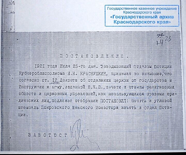 Но настоящую беду принесло монастырю восстановление на Кубани советской власти. Об этом тоже говорят архивные документы. 5-м мая 1921-го года датировано письмо, адресованное Отделу юстиции, за подписью Председателя Кубано-Черноморского облисполкома. Вот содержание этого письма, хранящегося в архиве: «Кубчероблисполком предлагает вне всякой очереди сделать распоряжение о немедленном и безоговорочном выселении монахинь из Покровского монастыря близ станицы Пластуновской, взять на учет все монастырские угодья с живым и мертвым инвентарем и передать таковые в распоряжение Кубано-Черноморского Областного Приюта». 24 июля 1921 года в присутствии понятых – священника и монахинь – заведующих ризницами – было описано все имущество храмов обители – от драгоценной алтарной утвари и облачений до швабр, ведер, совков и свечных огарков. Изъяты были также большие суммы денег. В акте от 28 июля 1921 года, подписанном секретарем Ликвидационного П/отдела и казначеем Отюста, указана сумма: «нашли их в количестве одного миллиона четырехсот тридцати семи тысяч восьмисот двадцати восьми рублей 26 коп. бумажными знаками, серебряной монетой 1 р. 05 к. и 2 монеты в 10 и 5 пфеннигов и медной монетой 14 р. 21 к.». Большевиками были изъяты все монастырские земельные угодья. Сделан обыск хозяйственных и жилых помещений (в том числе кельи игумении и жилья священника) и территории. Найдены и изъяты большие запасы зерна – всего было вывезено приблизительно пять с половиной тысяч пудов. Зерно вывозилось на ссыпной пункт станицы Динской и увозилось автомобилями в город Краснодар.