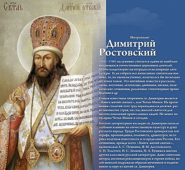 Митрополит Димитрий (1651–1709) – выдающийся деятель Русской Церкви последней четверти XVII – начала XVIII века, прославленный архиерей, пастырь и проповедник; талантливый агиограф, историк и драматург. Его можно назвать одним из самых известных и любимых духовных писателей дореволюционной России. «Кому в России не известны его великие заслуги Церкви, прославленные и по смерти даром чудотворения? Кто из нас не читал его творений и не умилялся теплым чувством, с которым они написаны?» - восклицал И. С. Тургенев [1]. Ростовский святитель внес весомый вклад в культуру нашей страны и всего славянского мира. Память о нем чтится не только в России, но и на Украине и в Белоруссии, в Сербии и Болгарии, среди православных Литвы, Молдовы и Румынии.