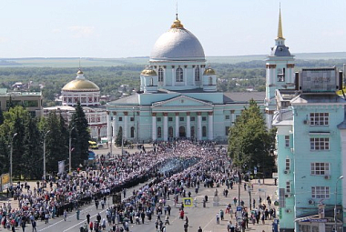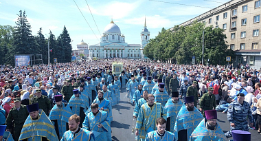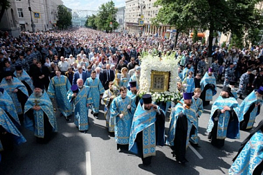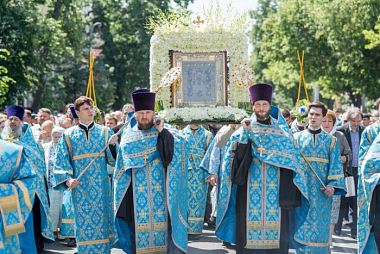 Когда под колокольный звон из собора вынесли икону Божией Матери «Знамение» Курскую-Коренную, архипастырь благословил святым образом Богородицы Курск на четыре стороны света и многотысячное шествие начало свой путь по центру города к Введенскому храму.