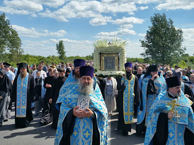 За богослужением молились игумении курских монастырей с сестрами и тысячи православных верующих, которые прибыли из разных городов и сел России, чтобы помолиться Пресвятой Богородице пред Ее святой иконой «Знамение» Курской-Коренной и пройти вместе с курянами крестным ходом в Коренную пустынь.