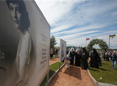 Архиереи возглавили открытие памятной аллеи в честь царской семьи и перерезали красную ленту возле начала аллеи.