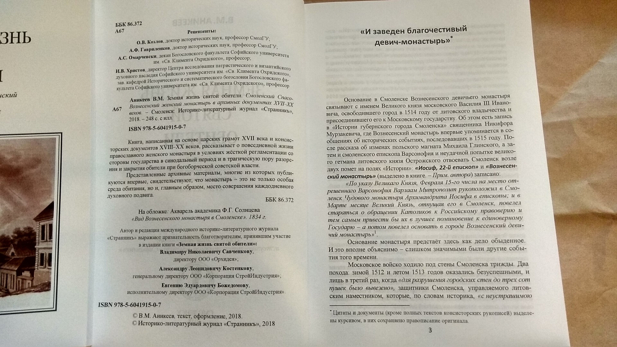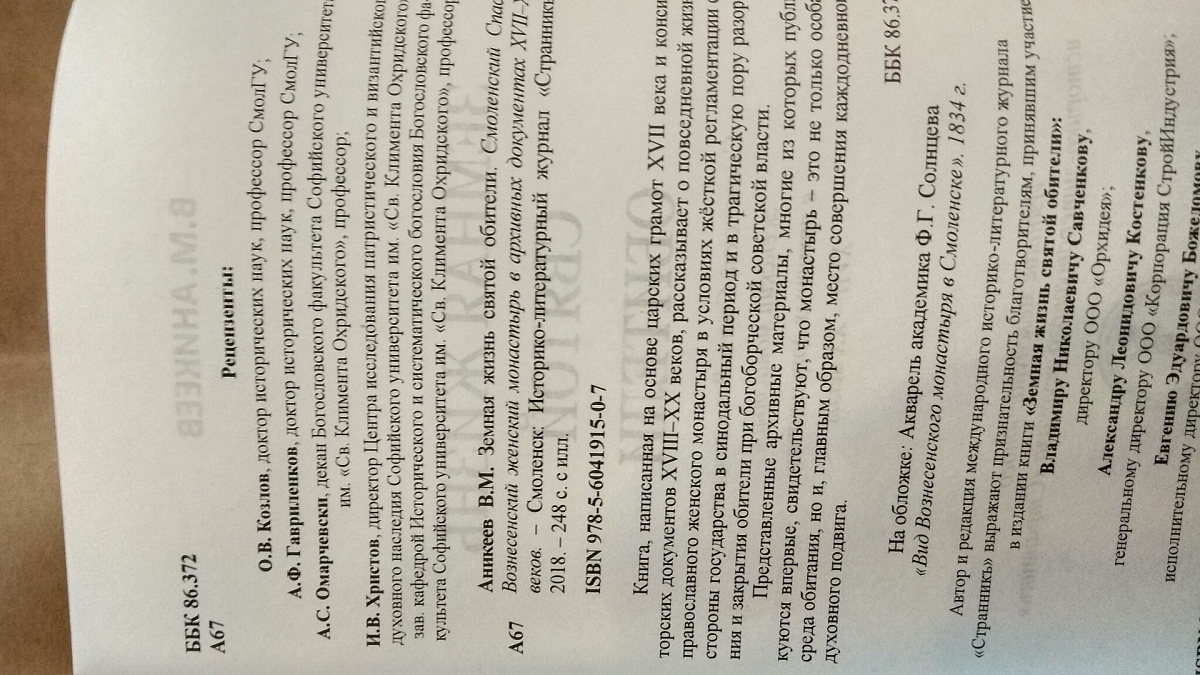 В ноябре 2018 года в издательстве международного историко-литературного журнала «Странникъ» г. Смоленска вышла в свет книга «Земная жизнь святой обители. Смоленский Спасо-Вознесенский женский монастырь в архивных документах XVII–XX веков». Автор книги – смоленский искусствовед, краевед и журналист В.М. Аникеев.