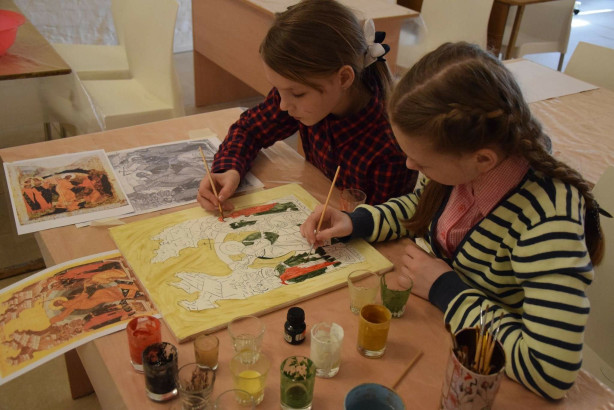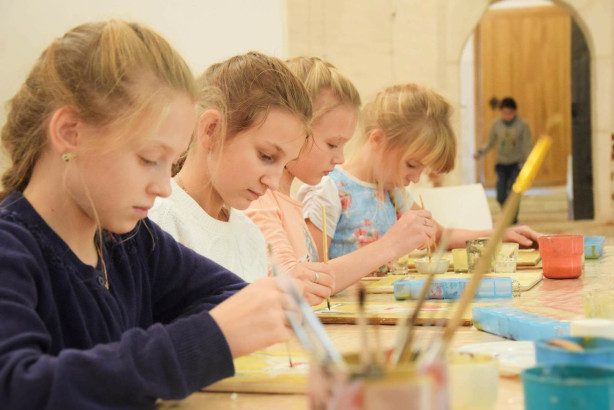 Но и сейчас ребята приходят в монастырь иногда не в воскресный день, когда проходят наши занятия, а в будни, просто так, небольшими группами, навестить меня после школьных уроков. Я в это время делаю росписи в монастырской трапезной, и дети имеют возможность посмотреть, как создается настенная композиция, помогают, держат палитру, наблюдают за процессом, задают вопросы. Я рассказываю им, как надо смешивать краску и проводить линии, а потом прекращаю работу, и мы идем пить чай. А иногда мы идем в храм, чтобы поставить свечи, и только потом – к столу. Время от времени я доверяю ребятам нарисовать какие-нибудь простые узоры на росписях не потому, что не успеваю, а чтобы у них остались приятные воспоминания, что они поучаствовали в важном деле. Это всё и есть, наверное, самые задушевные моменты в нашем изучении иконописи.