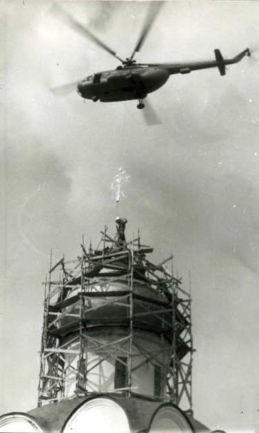 Да! Иначе, как чудом, все происшедшее затем не назовешь. Врезалось в память наше второе утро в монастыре. В 7 утра мы услышали, как кто-то под окошечком нашей кельи, расположившейся прямо в стене, тоненьким голоском читает молитву. Открываем дверь – стоит худенькая женщина несколько болезненного вида. «Матушки! Мне сказали, что вы приняли сто сестер, возьмите меня хоть сто первую…» Мы отвечаем: «Проходи, будешь первою!» И хоть Галина была инвалидом, но стала для нас настоящим благословением Божиим. Как посыпались на нас милости! Кто-то везет плиту, кто стул, кто продукты! А один случай был вообще потрясающим. Надо было поднять новый крест на купол Троицкого собора. Мы даже представить не могли, какими силами будем это делать. В этих хлопотах и не обратили особого внимания на подтянутого интеллигентного мужчину, который спросил, что мы собираемся делать с крестом. А через пару дней увидели, как над куполом храма кружит вертолет. Мы понять ничего не можем. А оказалось, что это командир летной части из Домодедова прислал летчиков, чтобы они подняли крест на купол. А на вопрос – сколько это будет стоить, даже возмутился: «Что вы, матушка! Как можно брать деньги с монастыря?!»