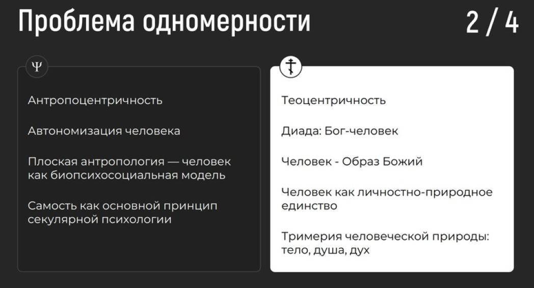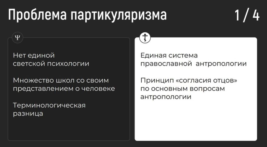 Фундаментом православной психологии является христианская антропология. Но часто в практической деятельности православных психологов эта идея принимается только на словах, чисто декларативно. Христианская антропология тогда используется только в качестве «свадебного генерала», а какие-то цитаты святых отцов – в качестве такого «бантика» сверху на собственно психологическом учении, которое может быть весьма далеким от христианства, а нередко и вообще антихристианским, например, взятым из психоанализа З. Фрейда, глубинной психологии К. Юнга, западной трансперсональной психологии и т. д.