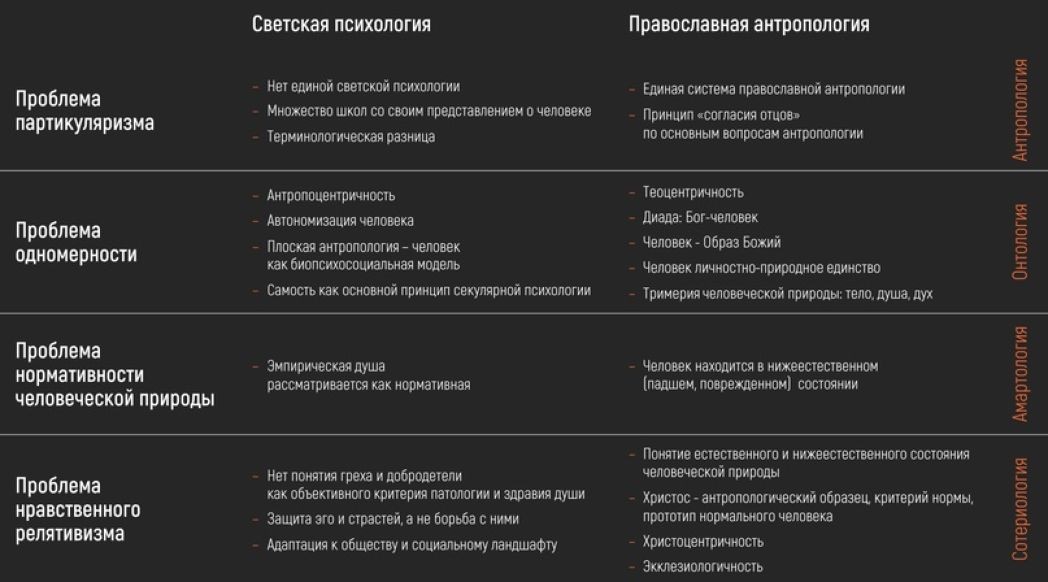 В таблице концепция православной психологии представлена как нечто искомое на стыке светской психологии и православной антропологии. В своих построениях мы опирались на видение православной психологии в представлении святителя Феофана Затворника, которого принято называть отцом православной психологии.