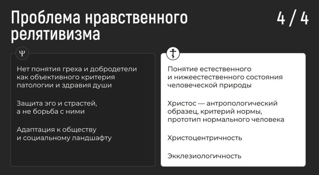 В светской психологии нет понятий греха и добродетели как объективного критерия патологии и здравия души. Исходя из предпосылки об изначальной «нормальности» человека, она говорит о нем как о жертве, а не о грешнике, защищает его эго и страсти, а не призывает к борьбе с ними. Происходит адаптация к обществу, к социальному ландшафту.