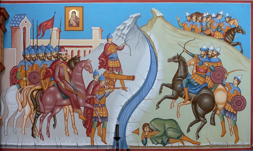 Видя то, что сегодня происходит в мире, как в нем неспокойно, взрывоопасно, мы переживаем за наше будущее и хотим укрепить Россию не только молитвой, но и какими-то внешними делами. Очень важно сейчас поднять дух народа. В наши дни приходится много слышать о патриотизме, но нередко это слова, слова, слова, которые лишь сотрясают воздух и не более. Мы же решили меньше говорить и больше делать. И стараемся развивать у россиян это чувство на живом примере, рассказывая им о подвиге, совершенном нашими предками в 1480 году. В ситуации полной неопределенности – быть Руси или не быть? – они насмерть стояли за Москву. Кровь свою проливали за землю Русскую и православный народ. Причем развиваем мы тему светлой победы в XV веке не по-мирски, а с церковной точки зрения. Люди должны знать, что Русь была спасена не только благодаря мудрой политике Ивана III и силе нашего оружия (русские войска уже имели огнестрельное оружие, и на Угре впервые была применена артиллерия в полевом бою). Прежде всего, Русь была спасена молитвой всех верующих – женщин, детей, стариков, которые 23 июня (по старому стилю), 6 июля (по новому стилю) пришли в Кремль и коленопреклоненно молились перед чудотворной Владимирской иконой Божией Матери, принесенной из Владимира в Москву. Так что единый фронт против монголо-татар начался тогда еще в Москве, у Владимирского образа Пресвятой Богородицы... Недавно ушедший ко Господу архимандрит Кирилл (Павлов) вспоминал, что в первые месяцы Великой Отечественной войны советские танки и самолеты горели, как фанерные. «Только появится мессершмит, даст очередь – и наши самолеты валятся.... А позднее, во время Сталинградской битвы, я был прямо восхищен: «катюши», артиллерия, самолеты наши господствовали, и было радостно за страну, за нашу мощь... Это все-таки Господь помогал нам!» – рассказывал наш дорогой старец, участник Великой Отечественной войны, ставший свидетелем того, как страна, где десятилетиями насаждали атеизм, в годину тяжких испытаний вспомнила о Боге. И в том далеком XV веке, когда русский народ обратил свой взор к небу, после горячих молитв к Пресвятой Богородице помощь пришла. Неожиданно хан Ахмат начал быстрое отступление к Орде. Летописец записал: «Бежали же татары с Угры, а были наги и босы, ободрались». Вскоре митрополит Геронтий установил праздновать 23 июня (6 июля) День Сретения Владимирской иконы Божией Матери в честь чудесного спасения Москвы от нашествия татар.
