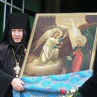 Под престолом находится почитаемое место с доступным для поклонения паломникам символическим камнем, где по преданию произошло последнее явление Архангела Гавриила Пресвятой Богородице. На южной стене висит икона Богородицы типа Одигитрия, получившая название Галилейская. Ее написала в 1960 году русская монахиня-иконописица Сергия (Трофимова) в память о своем духовном отце игумене Серафиме, о чем свидетельствует оставленная на иконе надпись: «Русский священноигумен Серафим. Умер в Галилее. 1875–1959 г. 22 февр.». В икону вправлены частицы мощей апостола Луки и священномученика Харлампия Магнезийского. Монахиня-иконописица Сергия выполнила многие иконы и настенные росписи в храме.