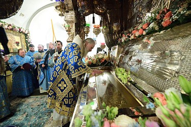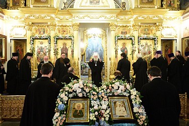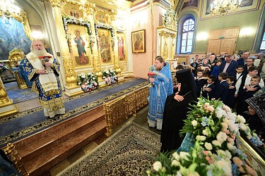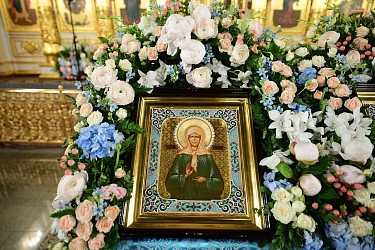 По прибытии в обитель архипастыри поклонились честным мощам блаженной Матроны Московской, почивающим в Покровском храме, а затем возглавили Божественную литургию в храме Воскресения Словущего.