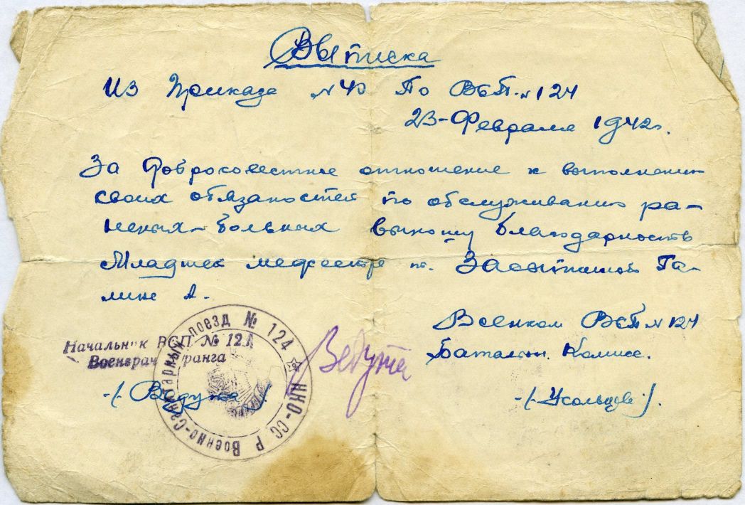 23 февраля 1942 года начальником поезда ей была вынесена официальная благодарность «за добросовестное отношение к выполнению своих обязанностей по обслуживанию раненых-больных» [14].