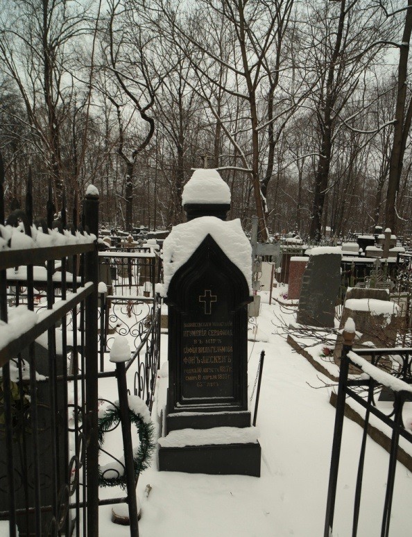 Многое, конечно, поразило при знакомстве с канвой жизни сестер. Например, то, что три дочери офицера Вильгельма Фон-Лескен, дослужившегося в Русской армии до чина полковника, были воспитанницами института благородных девиц и свободно изъяснялись на русском, французском, немецком языках, но две из них, старшая и младшая, придя в православный монастырь (московский Рождественский), на протяжении многих лет смиренно выполняли рядовые послушания. Старшая продавала свечи, младшая была письмоводителем обители. А средняя их сестра, имевшая, видимо, незаурядные способности, всего через три года после монашеского пострига была возведена в игуменский сан. В ее послужной список входит недолгое, менее полугода, пребывание настоятельницей древнего Брусенского Свято-Успенского монастыря в Коломне, затем возвращение в качестве настоятельницы в московский Рождественский монастырь. И, наконец, матушка Серафима возглавила первоклассный Вознесенский монастырь в Московском Кремле, служивший усыпальницей великих княгинь, княжен и цариц из царского дома. Почему она, будучи в Рождественской обители, не «возвысила» родных сестер, дав им, допустим, какие-то особо ответственные послушания? Почему, став настоятельницей обители в Кремле, не торопилась перевести сюда монахиню Леониду и монахиню Анастасию (сделала это только тогда, когда почувствовала близкую кончину и пожелала проститься с родными людьми)? Думается, ответ прост: игумения Серафима прежде всего служила Богу и видела в монашестве средство спасения души, а не способ легко и комфортно провести годы земной жизни. Сама матушка редко покидала святую обитель. Она очень любила церковную молитву и молилась практически на всех монастырских службах, пока не заболела водянкой. Спокойная, миролюбивая, удивительно кроткая – такой облик настоятельницы древнейшего монастыря вырисовывается при знакомстве с архивными материалами... Отошла ко Господу игумения Серафима 8 апреля 1893 года. В некрологе сообщалось, что она похоронена на участке обители на Ваганьковском кладбище. Как раз после прочтения этих строк стало понятно, что на Ваганькове имеются свои участки у московских монастырей, и нужно продолжить их поиск. Вскоре были найдены другие погребения насельниц Вознесенской обители – дореволюционные и послереволюционные. Кроме того, при дальнейших исследованиях участка были обнаружены четыре дореволюционных погребения монахинь Рождественского и одно – монахини Ивановского (в Китай-городе) женских монастырей. Судя по всему, современный 19-й участок Ваганьковского кладбища некогда был определен для захоронений крупнейших женских обителей Москвы.