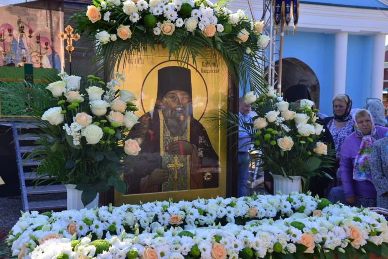 В центре соборной площади была установлена украшенная цветами рака со святыми мощами новопрославленного преподобного.