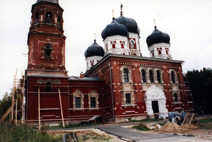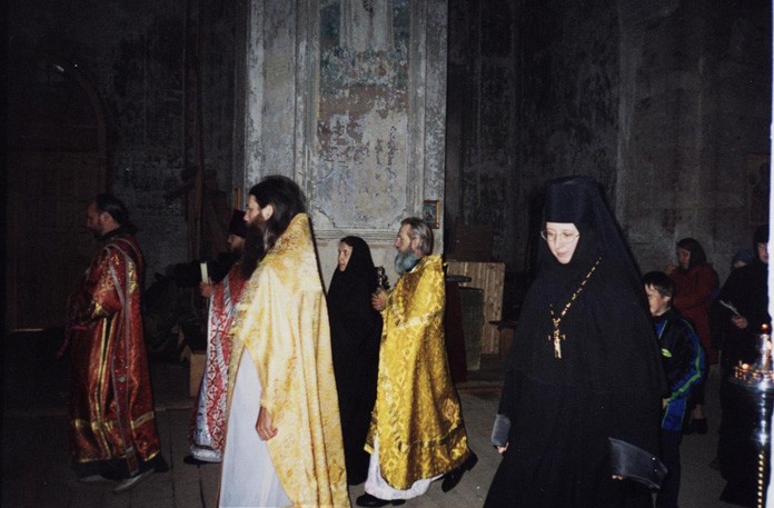 К моменту открытия монастыря у собора была покрыта крыша прохода между колокольней и центральной частью храма, и начаты работы по замене покрытия куполов, но собор в это время еще представлял собой огромный котлован, в котором стояла вода. В сестринском деревянном корпусе, который находился в аварийном состоянии, проживали люди, но часть помещений, малопригодных для проживания в них людей, пустовало, и дом был передан монастырю в долгосрочную аренду. Здание почты, также в крайне аварийном состоянии, было передано монастырю сразу после его открытия. Помещение кирпичного здания с домовой церковью продолжало использоваться как база отдыха, но через некоторое время каменный корпус был передан монастырю, и в нем немедленно началось восстановление домовой церкви Божией Матери «Утоли моя печали». В 1997 году на месте полуразвалившихся сараев с помощью администрации района был построен новый настоятельский корпус.