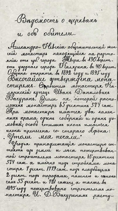 Все приведенные здесь сведения взяты из "Ведомостей о церквах и об обители" за 1915 г. Документ подписан настоятельницей Александровского женского монастыря игуменией Измарагдой, казначеей монахиней Августой и благочинной монахиней Михаилой.