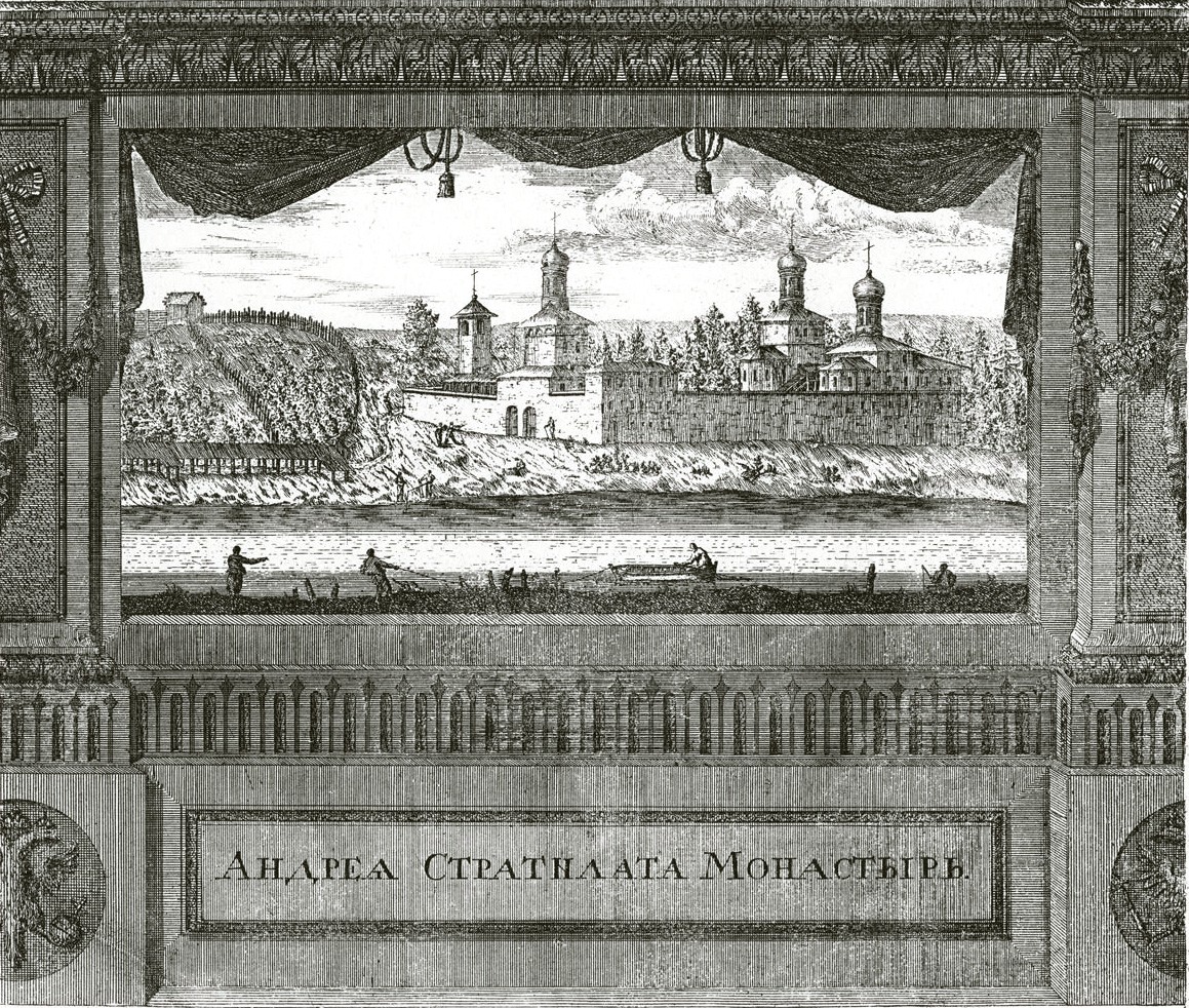 В 1591 году Москва была чудесно избавлена от набега войск крымского хана Казы-Гирея. Битва, в которой защитники города одержали победу, произошла в день памяти мученика Андрея Стратилата (284–305), а вскоре в обители, в благодарность Богу за спасение, был построен деревянный надвратный храм во имя святого мученика.