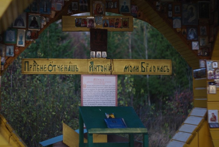 Под надгробием сделано отверстие, из которого верующие берут на память белый песок, обычно добываемый в Дымском озере. Перед гробницею стоит старинный образ Антония Великого (XVIII века) новгородского письма.