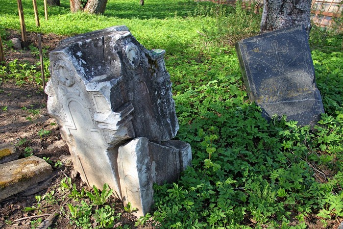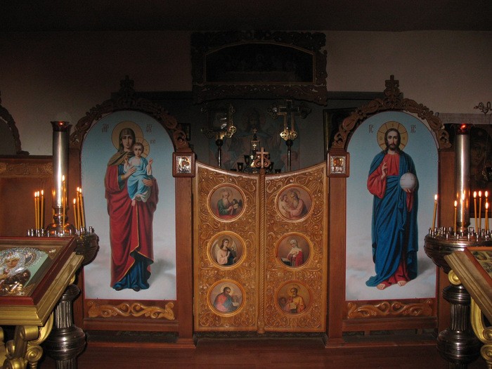 Кое-где по стенам паперти и церкви развешены в одиночку иконы старинного иконостаса, но подновленные и заолифенные".