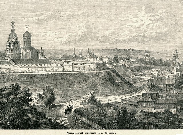 Владимирский в честь Рождества Пресвятой Богородицы мужской монастырь основан между 1197 и 1206 гг. во Владимире князем Всеволодом (Димитрием) Юрьевичем Большое Гнездо. Южной и восточной границей Богородице - Рождественского монастыря служил вал так называемого Печернего города, на западе к монастырю примыкала резиденция князя, а также соборы Димитрия вмч. и Успения Пресвятой Богородицы. В наиболее раннем описании Владимира - писцовой книге И. А. Головленкова и В. Львова 1624-1625 гг.- эта местность названа «кремлем» .