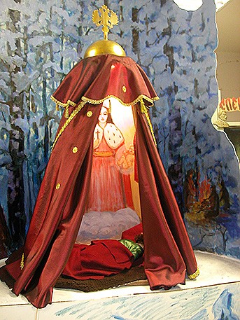 Ночью, когда тихий сон смежил усталые царские очи, вдруг показалось ему, что шатер его осветился необыкновенным сиянием, и перед ним предстала дева ангельской красоты, облаченная в белую, как снег, одежду» «Не ужасайся, Царь, – сказала она, – но благодари Господа. В эту ночь по Его воле разрешилась от бремени супруга твоя и принесла тебе дщерь на утешение». Царь узнал небесную гостью – это была великомученица Екатерина.