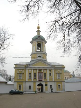 Около 1800г. Святые ворота с колокольней были полностью перестроены. На них была возведена монументальная надвратная церковь свт. Николая Чудотворца ( к концу ХIХ в.-свт. Димитрия Ростовского) с колокольней – яркий, нестандартный образец архитектуры московского классицизма. Вытянутый в ширину нижний объем (ворота с Храмом над ними) контрастирует с легкой цилиндрической колокольней, увенчанной шпилем. Рустованный нижний этаж, прорезанный не большей аркой св. ворот воспринимается как цокольный. Здание церкви с юга и севера снабжено плоскими портиками с широкими треугольными фронтонами. В центральной части портиков включены неглубокие двухколонные лоджии. Внутри храм имеет форму ротонды с узкой апсидой и перекрытым крестовым сводом притвором. Храм имеет ротондальные угловые камеры. В западных камерах находятся лестницы, северо-восточная служит жертвенником, а юго-восточная связывает храм с восточным прямоугольным пространством. Храм был расписан к 90 гг. ХIХв. На колокольне имелись часы с боем.