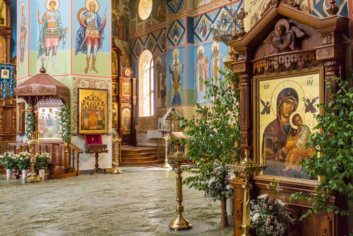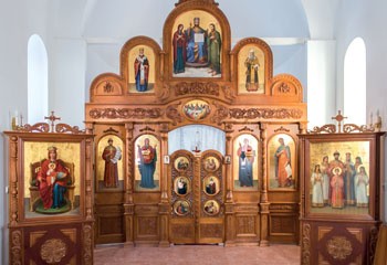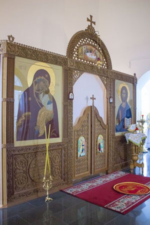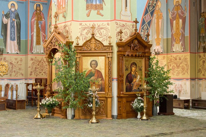 Алтарь был просторным. На горнем месте стояла большая икона Пресвятой Троицы с предстоящими внизу Божией Матерью, святыми угодниками и ангелами. Эта икона, подаренная Преосвященным Евсевием, писана на холсте, помещена в вызолоченную раму с такой же резьбой.