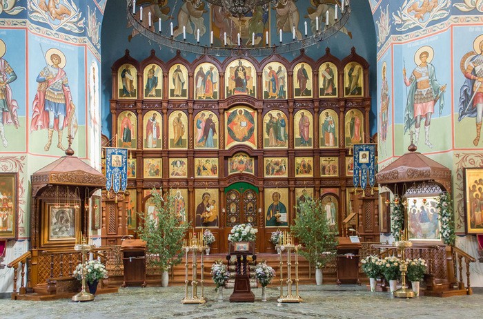Главный, центральный, алтарь храма посвящен Иверской иконе Пресвятой Богородицы. Восточная стена алтаря украшена композицией «Литургия святых отцов» – ростовыми изображениями великих святителей: Григория Богослова, Иоанна Златоуста, Василия Великого и др. Над горним местом, в конце алтарной апсиды, – традиционное изображение Богородицы – Оранты. Над Престолом размещена композиция «Се Агнец Божий». Верхний регистр южной и северной стен посвящен страстному циклу. Под потолочным сводом находятся росписи «Моление о чаше Господа нашего Иисуса Христа» и «Распятие Господа нашего Иисуса Христа», «Омовение ног» и «Тайная вечеря». Под ними нижним ярусом продолжена тема Литургии святых отцов изображением Святителей Климента, папы Римского, Григория Нисского, Иоанна Милостивого и других. Арка над царскими вратами содержит изображения первосвятителей Московских.