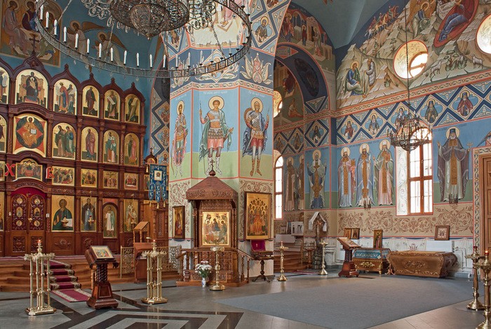 Столбы Иверского храма расписаны ростовыми фигурами мучеников, благоверных князей, преподобных столпников Симеона и Даниила и других святых.