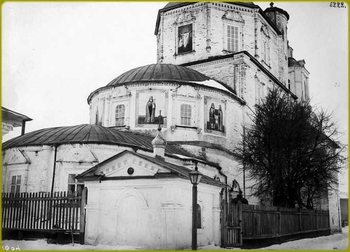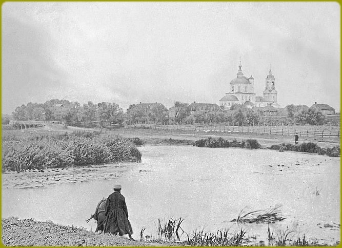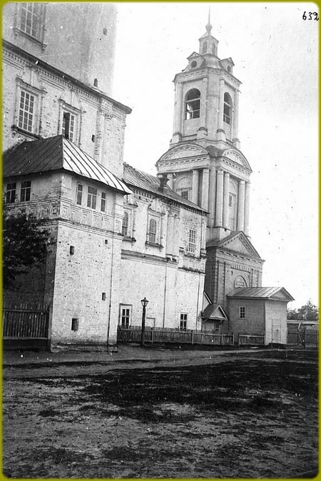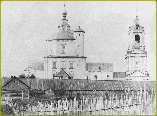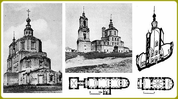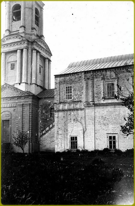 В конце XVI века иеромонахом Тихоном был основан Воскресенский монастырь, называемый также Тихоновой пустынью. До конца XVII века все постройки монастыря были деревянными. По описанию сына антиохийского патриарха, архидиакона Павла Алеппского, посетившего обитель в 1654 году на пути в Москву, деревянный соборный храм Воскресения отличался своей стройностью и высотой. Поставленный на высокий подклет и окруженный галереей с тремя входами, он имел трехчастное построение с расположенными над каждой, частью главами, легкими и изящными. Весьма высокой была и восьмигранная колокольня, завершенная куполом.