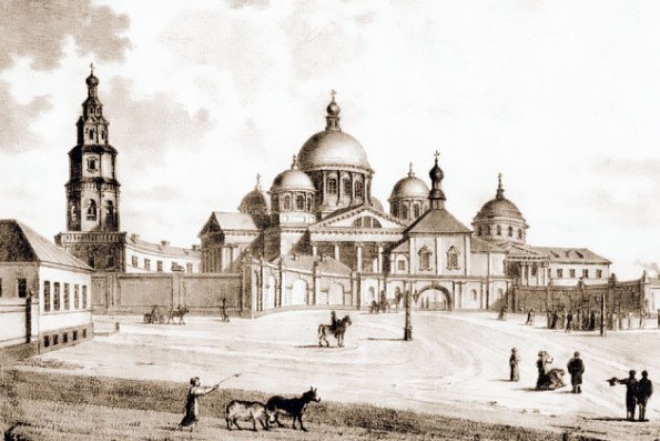 По монастырским документам она построена в 1807-1825 гг. (строительство прерывалось пожаром 1815 года) по проекту архитектора Я.М. Шелковникова на средства дворян Мусиных-Пушкиных.