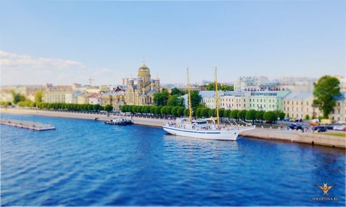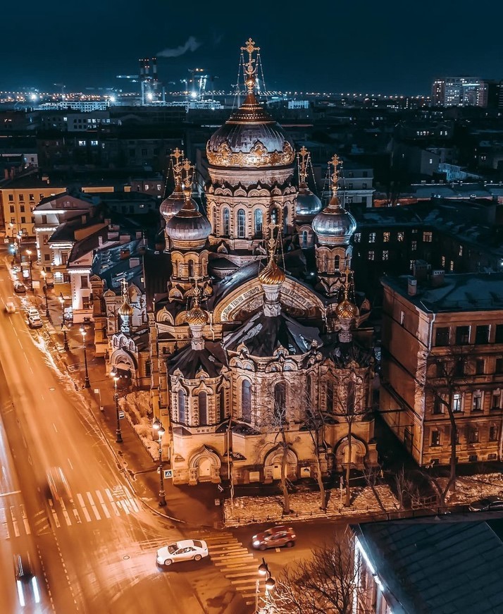 С Благовещенского моста, что ведёт на Васильевский остров из центра Петербурга, хорошо виден православный храм Успения Пресвятой Богородицы.