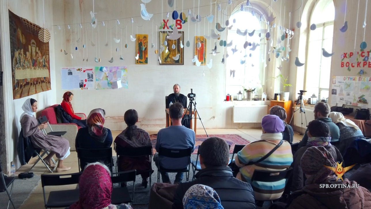 Воскресная школа при Оптинском подворье в Санкт-Петербурге была открыта в 1994 году. С этого времени прихожане храма регулярно приводили на занятия своих детей, которые могли творчески развиваться и быть ближе к церкви. На первые занятия приходило около двадцати детей, среди них были воспитанники городских детских домов. Сначала занятия в школе были творческие (вышивание, пение, кулинария), затем их количество стало увеличиваться. Были введены лекции по Закону Божьему, катехизису, литургике, истории церкви. Воскресную школу посещали и взрослые прихожане, так образовались две группы — взрослая и детская.
