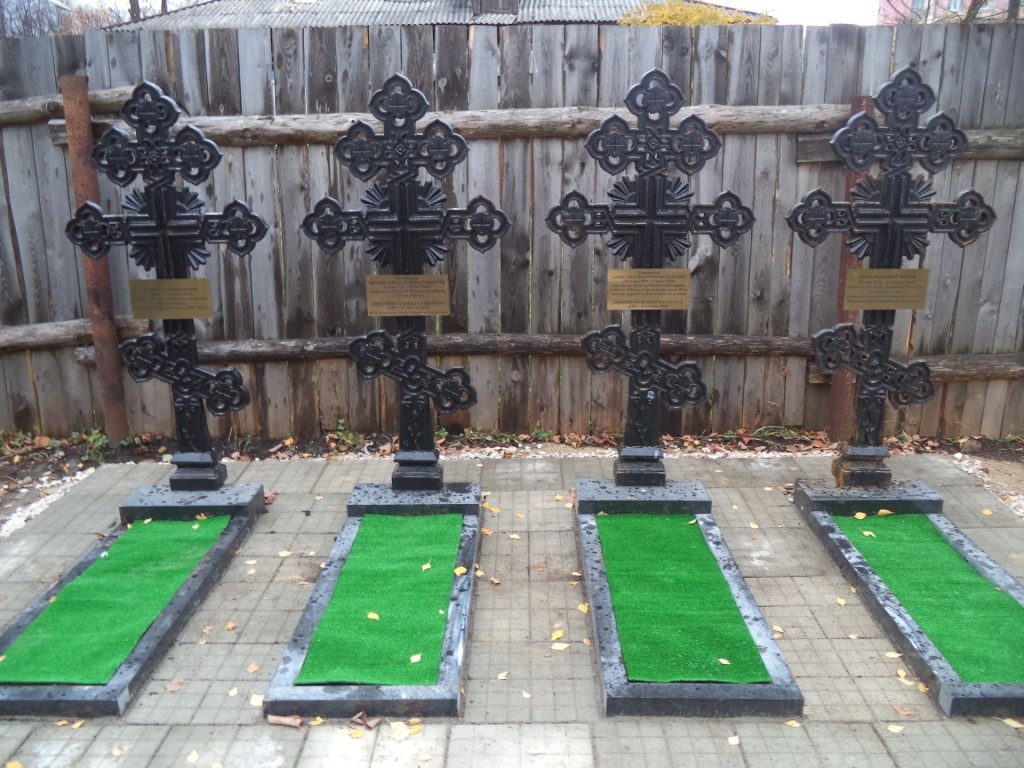 За алтарной частью установлены кресты на могилах настоятеля Покровского храма протоиерея Иоанна Субботина (1790-1860) и его жены Анны Николаевны (1800-1872), настоятеля протоиерея Александра Казанского (1831-1904) и его жены Евдокии Яковлевны (1835-1906), старосты храма, купца I гильдии Ивана Федоровича Попова (1804-1860), старосты храма, купца I гильдии, потомственного почетного гражданина Ивана Ивановича Попова (1836-1910).