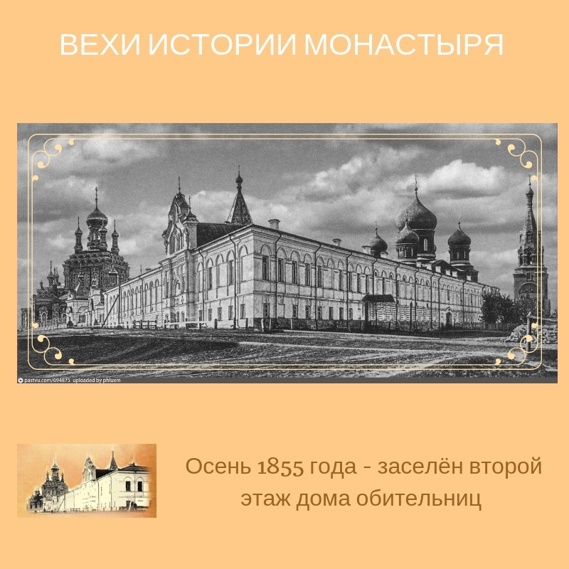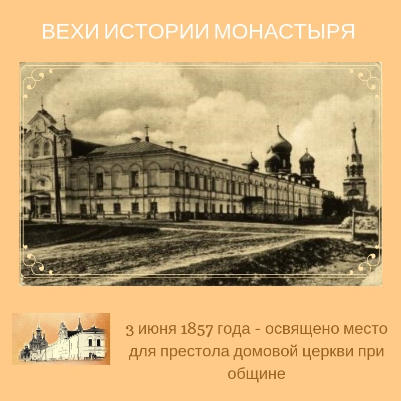 В 1850-е годы был построен первый келейный корпус. В 1856 году настоятельница общины Ксения Шепелева обратилась к Преосвященному Неофиту с просьбой устроить при общине домашнюю церковь во имя Божией Матери. Ходатайство это было уважено и 3 июня 1857 года Преосвященный неофит освятил место для престола домовой церкви при общине, в первом келейном корпусе.