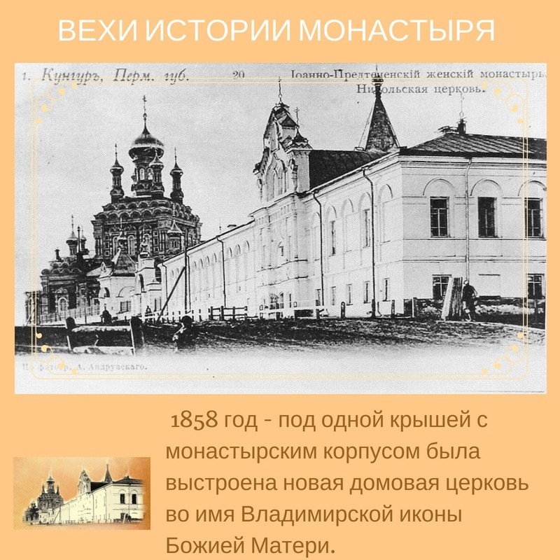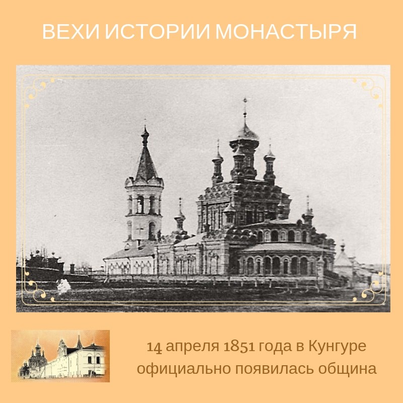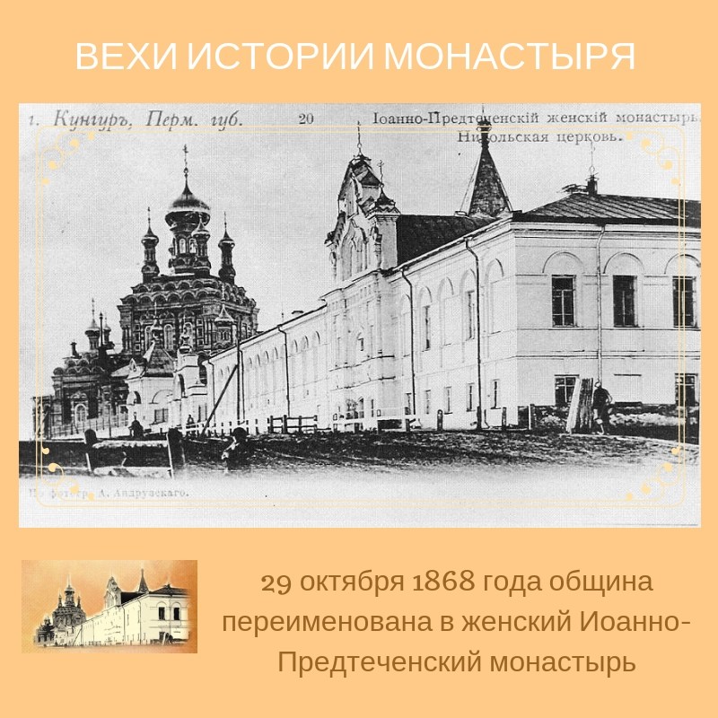 14 апреля 1851 года состоялось Высочайшее утверждение Кунгурской Иоанно — Предтеченской общины. В нее вошли 23 сестры. Попечителем общины стал кунгурский купец А.Г. А.Г.Пиликин , который в течение 15 лет руководил строительными работами на территории монастыря.
