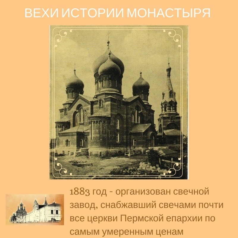 В 1874 году при монастыре было открыто свечное производство.В мае 1877 года с главным храмом был заложен храм в честь святых великомученика Пантелеимона и праведного Симеона Верхотурского Чудотворца. Храм был устроен во втором этаже и соединен с главным тремя арками.