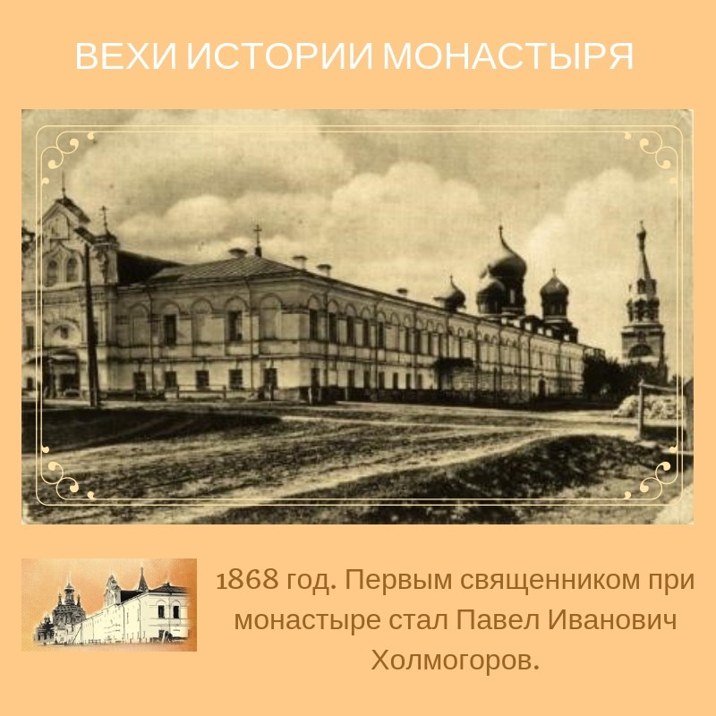 29 октября 1868 года последовал указ Священного Синода о переименовании общины в женский Иоанно — Предтеченский монастырь с числом монахинь, кроме игумении и казначеи, из 15 лиц без отнесения этого монастыря к какому-либо классу штатных монастырей и без пособия из казны. Первым самостоятельным священником при монастыре был отец Павел Иванович Холмогоров.