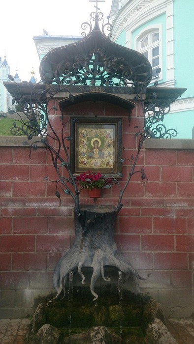 Была обновлена и церковь «Живоносного источника». В центре её, перед алтарем, находился огороженный железной решеткой колодец; в металлический чан, сооруженный для лучшего течения воды Коренного источника, верующие имели обыкновение бросать серебряные и медные деньги; иногда собиралась немалая сумма. Южные двери храма выходили на небольшой дворик, на западной стороне которого покатость была обсечена отвесно и вымощена камнем; неподалеку сквозь проделанное в камне отверстие можно было увидеть корень того самого вяза, у которого была найдена в 1295 году чудотворная икона Знамения Божией Матери. В 1885 году корень еще испускал три живых зеленых отростка. Деревянный щит с изображением Коренной иконы в момент обретения, в руках нашедшего её человека с фонарем-лампадой пред нею, укрывался сверху деревянной крышей на столбах; внизу – деревянный помост, над которым истекал чудотворный источник, тут же трубою отводимый внутрь церкви, в колодец с чаном, а из него трубой – к реке Тускари.