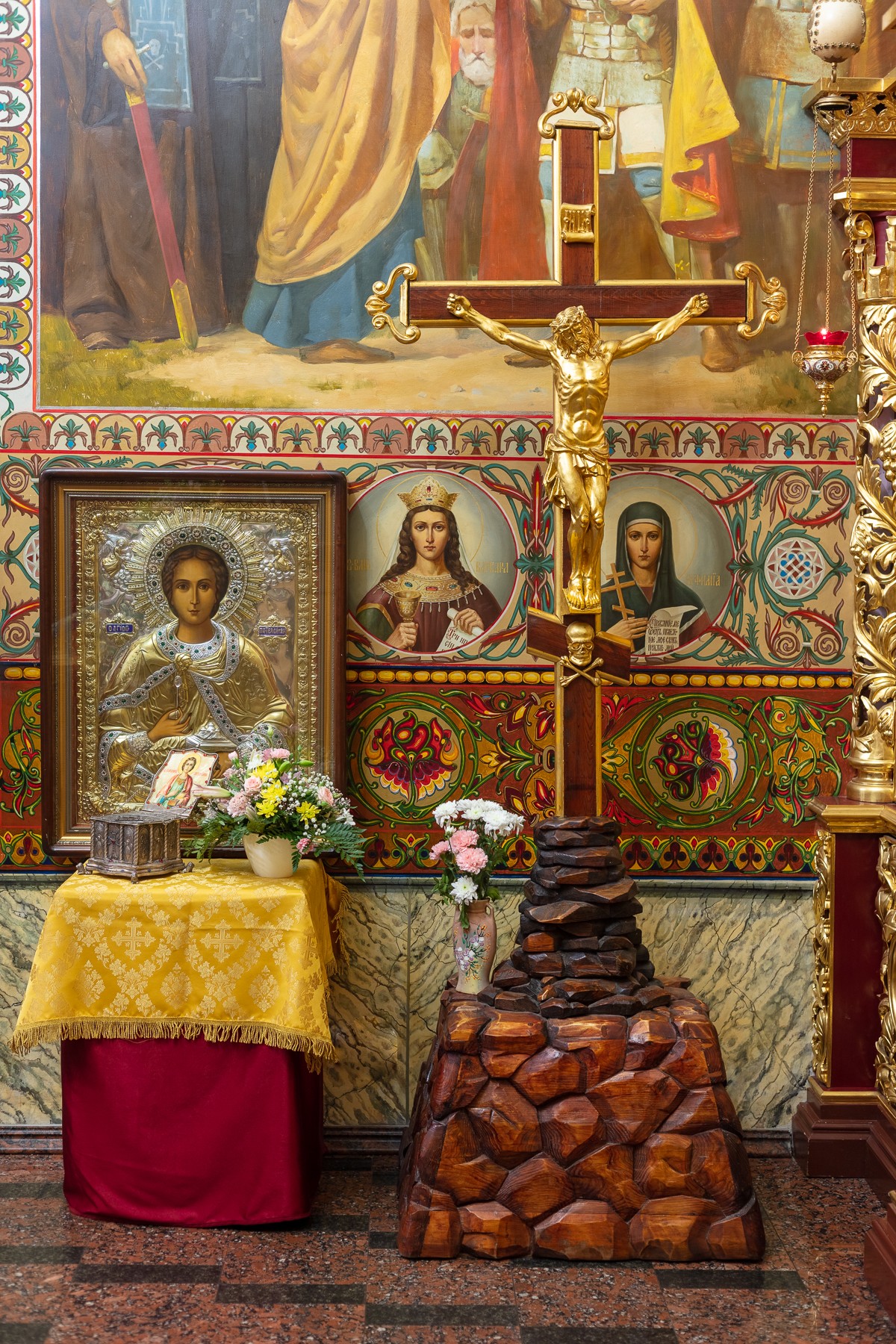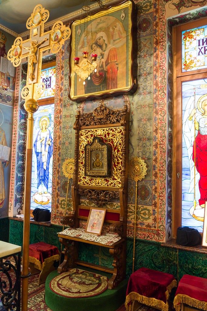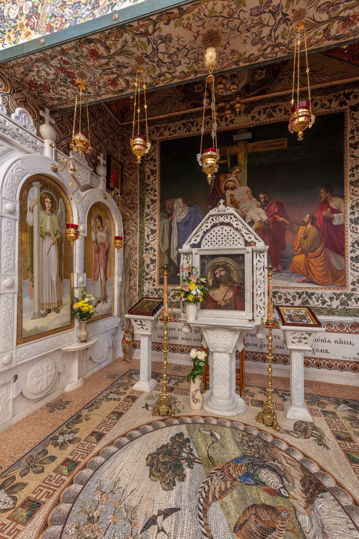 Небольшой объем внутренних помещений, величественное и одновременно сдержанное убранство храма, мозаичные иконы Богородицы, апостола Иоанна и семи архангелов – все призвано воссоздать атмосферу святого места и вызвать благоговейный отклик в душе.