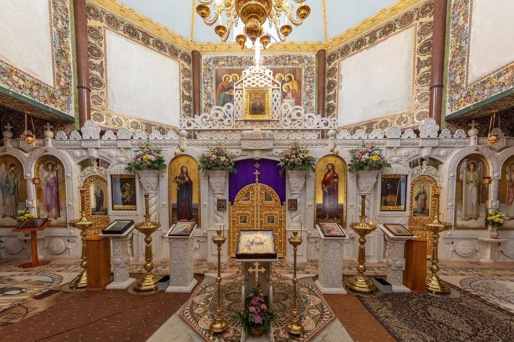 Все события Страстной седмицы нашли отражение в убранстве храма, отличающимся своим великолепием и торжественностью. Резной мраморный иконостас с уникальными, редкими по содержанию иконами сияет ослепительной белизной на общем фоне разноцветных мозаик и приглушенных тонов монументальных живописных композиций.