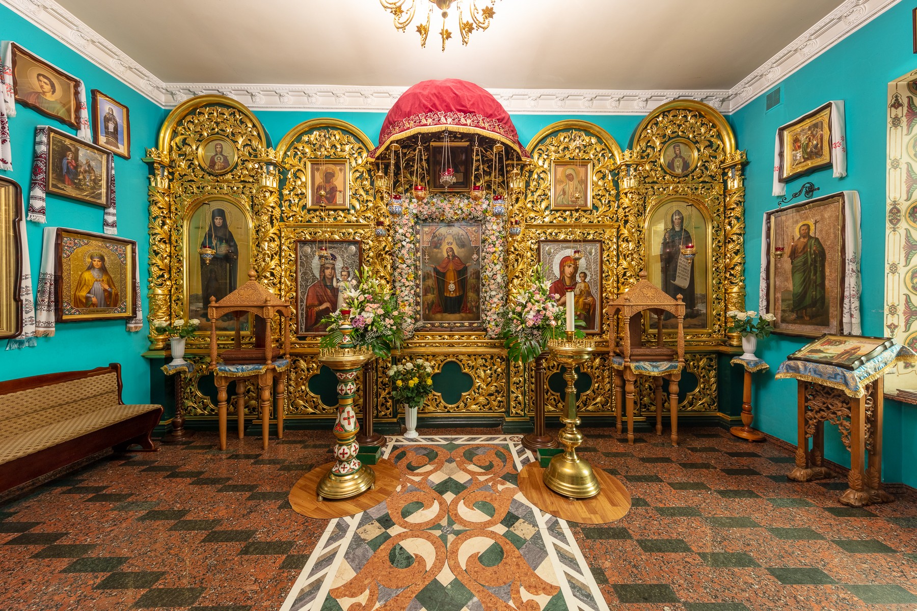 Главными святынями домового храма являются иконы Божией Матери «Всех скорбящих радость» (XIX в.) и «Богородица Грузинская». В храме находится большое количество икон с мощами святых угодников Божиих. Главный дом усадьбы стал отправной точкой в формировании монастырского ансамбля, а отдельные архитектурные элементы памятника повторяются в новых постройках обители, стилистически объединяя все сооружения в единое, гармоничное целое.