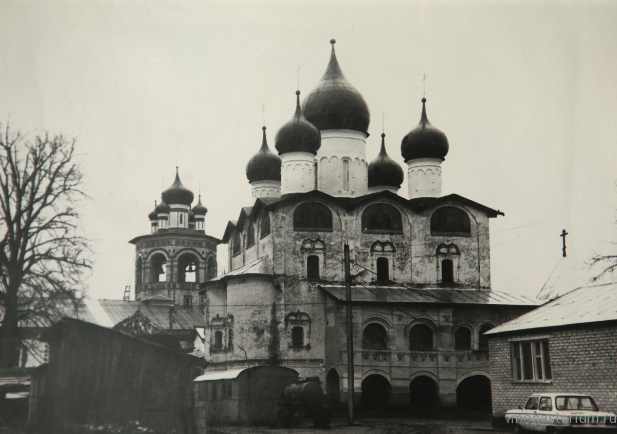 В 1681 году на месте обветшавшего Никольского храма был заложен двухэтажный, четырехстолпный, пятиглавый, окруженный папертью и галереями собор с тем же посвящением. Его освятил в 1685 году митрополит Новгородский Корнилий. В 1691 году в подцерковье собора, над могилой святителя Евфимия, был освящен придел в его честь. Здесь почивали под спудом мощи святителя и хранились его вериги. Архитектурный ансамбль монастыря продолжал создаваться и в следующем столетии. Его уникальной особенностью является убранство фасадов и интерьеров полихромными изразцами, выполненное в 1-й четверти XVIII века. Особенным богатством изразцового декора отличается церковь во имя апостола Иоанна Богослова.
