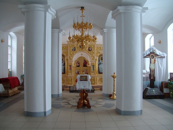 Резной иконостас был декорирован витыми колонками, изображениями херувимов, покрытых листовым золотом. Царские врата с искусным переплетением растительного орнамента были дополнены выразительными фигурами четырех евангелистов.