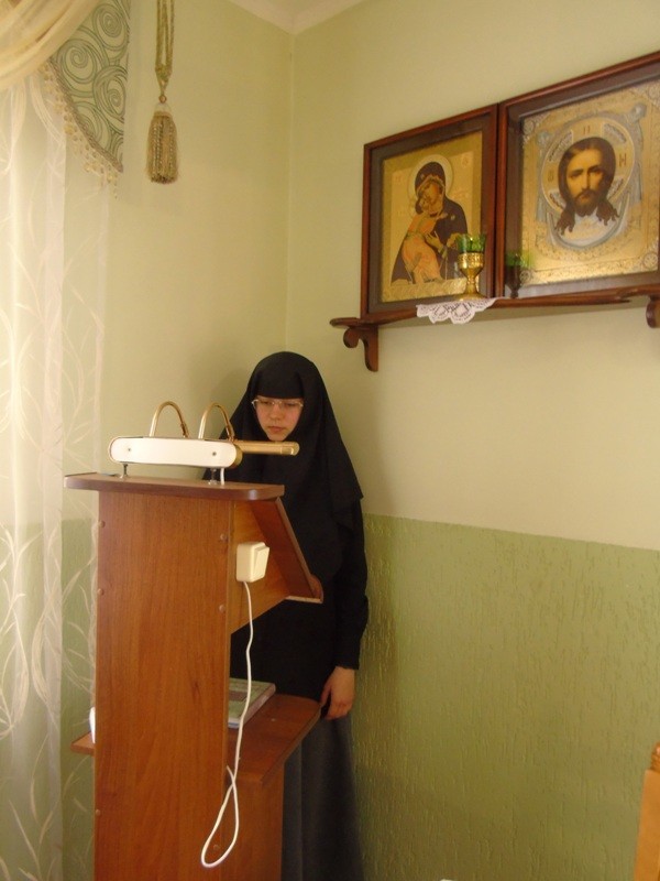Если нет вечернего богослужения, в 19 часов сестры идут в храм на монашеское правило, где читается малое повечерие с каноном и акафистом Божией Матери. После правила все расходятся по кельям для келейной молитвы и отдыха. А ночью опять на молитву – каждая сестра читает свой час Неусыпаемой псалтири.