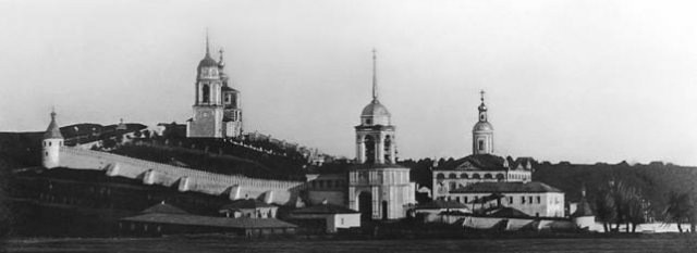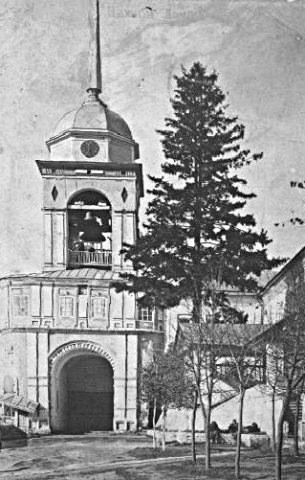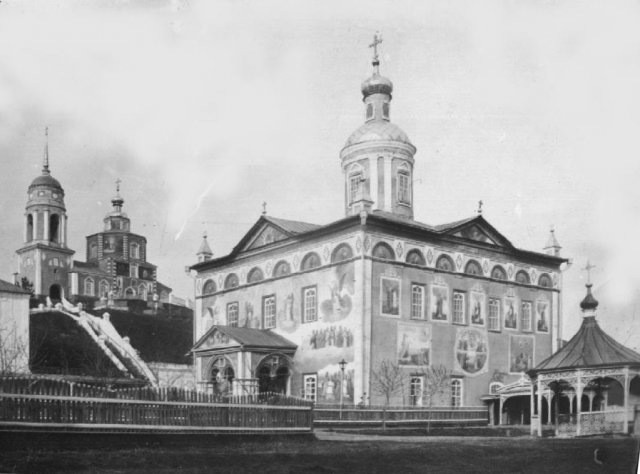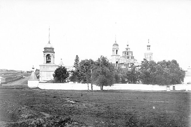 На горе, из-под подошвы которой бьет святой родник, в 1742-1757 гг. появилась церковь Сергия Радонежского с колокольней – также каменная взамен деревянной. Она считалась кладбищенской, хотя монахов и почетных мирских покойников хоронили по всей горе вплоть до Казанской церкви. Наконец, Всесвятская церковь помещалась над Святыми вратами и под колокольней (1776-1779); колокольню к началу ХХ в. украшали часы, «куранты». Ограду с четырьмя башнями по углам возвели в 1742 г. А еще были в обители три двухэтажных жилых корпуса – настоятельский и два братских, хозяйственный двор, ризница, ледник, две бани, три амбара, здание для извести, а за оградой – два гостиных корпуса и 37 ярмарочных лавочек. С востока к монастырю примыкал фруктовый сад.