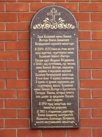 На месте, где до революции стоял Казанский храм Нижнеломовского Казанско-Богородицкого мужского монастыря, недалеко от источника, на котором в 1643 году явился образ Казанской Богородицы, в 2004 году был построен храм в честь Казанской иконы Божией Матери.