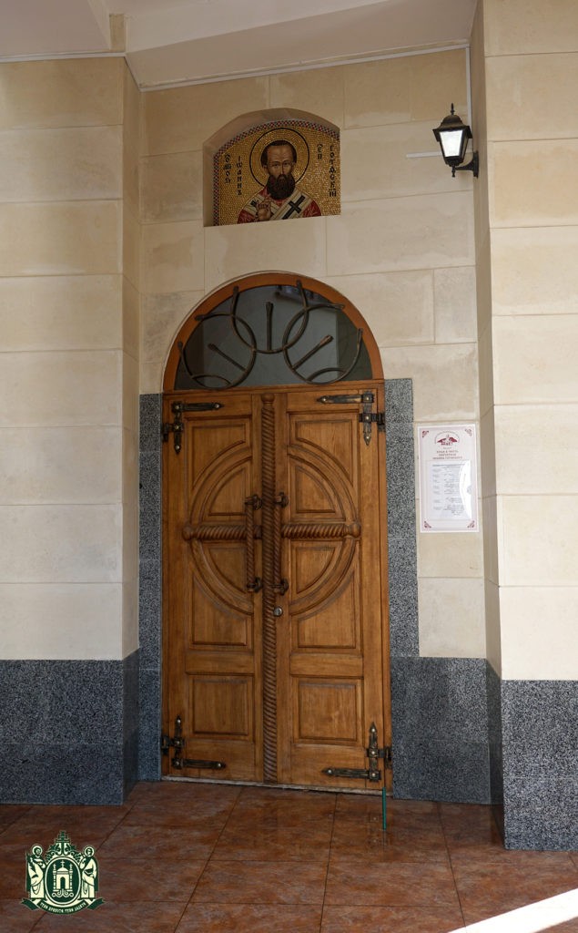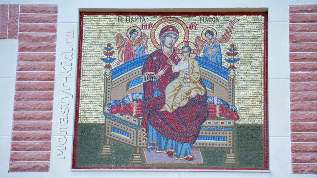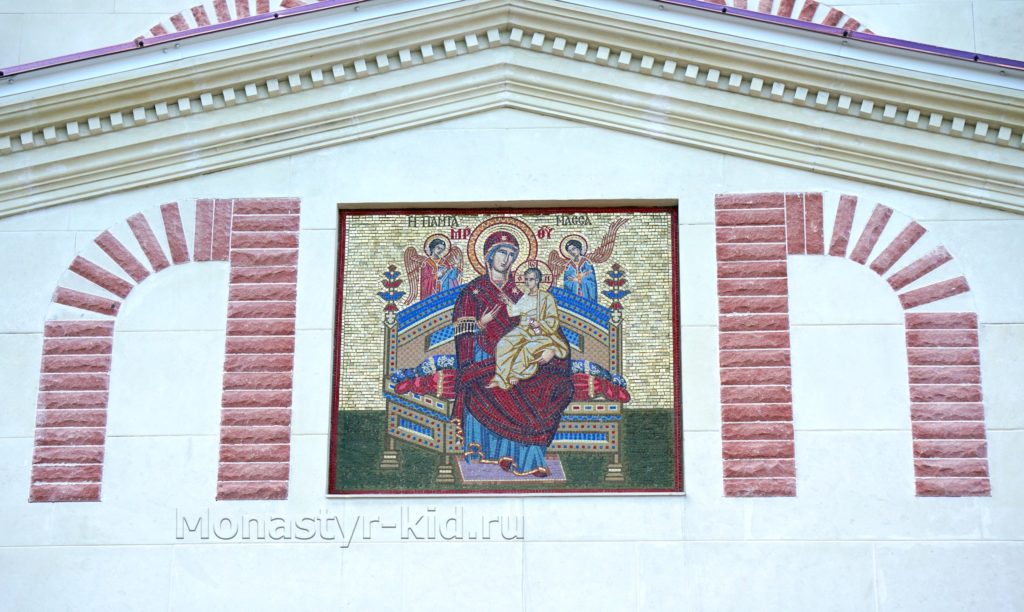 Образ Божией Матери встречает прихожан монастыря еще на улице — Богородица изображена на уникальном мозаичном панно, украшающем главный вход в храм.