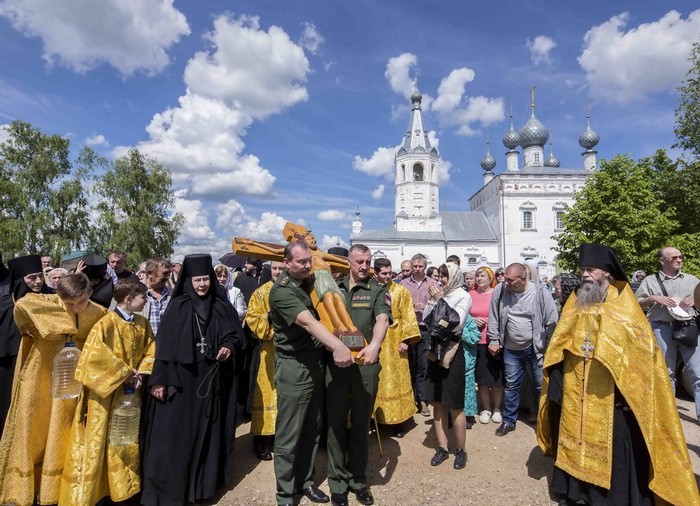 Животворящий Крест Господень — одна из величайших святынь православной России — нашел свою обитель в Храме во имя святителя Иоанна Златоуста в селе Годеново, неподалеку от города Переславль-Залесский. Храм входит в подворье Никольского монастыря, и сестры многие годы ведут историю Животворящего Креста Господня, явившегося пастухам на Сахотском болоте в 1423 году. …Сначала пастухи увидели «свет неизреченный с греческой стороны». Затем, подойдя поближе, заметили будто висящий в воздухе Крест с распятым на крестном древе Спасителем и, предстоящим у Креста Святителем и Чудотворцем Николаем со Святым Евангелием в руках. И услышали они голос, который велел им на этом месте построить Храм — «дом Божий»… Удивительна и чудесна история Животворящего Креста. Он уцелел в огне, когда сгорела старая церковь, он выстоял, когда после 1917 года богоборцы пытались распилить его пилами и разрубить топорами. И все эти годы — без малого шесть столетий — Животворящий Крест даровал людям Чудо исцеления от различных недугов и прощения.