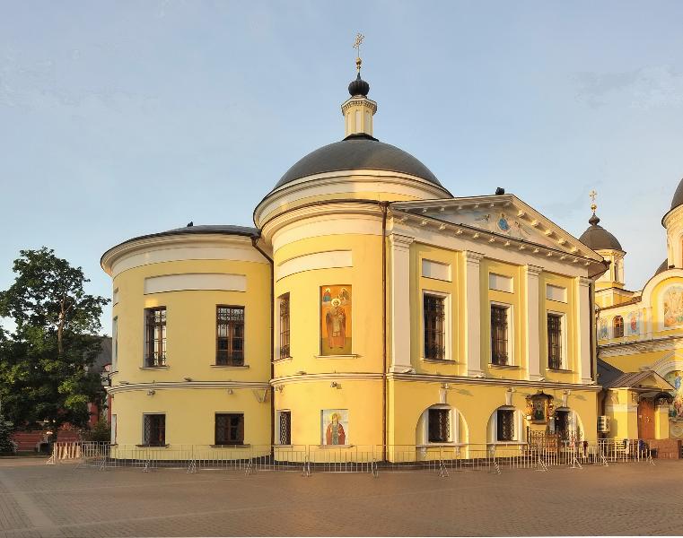 В середине XIX века Всехсвятский храм, ставший тесным, был перестроен по проекту архитектора М.Д. Быковского и приобрел вид величественного просторного пятикупольного храма с тремя престолами: в честь Воскресения Словущего, Тихвинской иконы Божией Матери и мученицы царицы Александры (последний ныне освящен в честь блаженной Матроны Московской). Таким образом, общее количество престолов в обители достигло 9, по числу 9 чинов Ангельских.